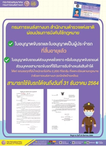 จากสถานการณ์การแพร่ระบาดของโควิด-19 ในปัจจุบันยังคงทวีความรุนแรงยิ่งขึ้น กรมการขนส่งทางบกจึงได้ประสานสำนักงานตำรวจแห่งชาติ ขอให้พิจารณาผ่อนปรนการบังคับใช้กฎหมายต่อเนื่อง ซึ่งสำนักงานตำรวจแห่งชาติ ได้พิจารณาขยายระยะเวลาผ่อนปรนการบังคับใช้กฎ ระเบียบ ข้อบังคับ คำสั่งใด กับผู้ได้รับใบอนุญาตขับรถตามกฎหมายว่าด้วยรถยนต์ และผู้ได้รับใบอนุญาตเป็นผู้ประจำรถตามกฎหมายว่าด้วยการขนส่งทางบก ที่สิ้นอายุแล้ว ยังสามารถใช้ขับรถต่อไปได้จนถึงวันที่ 31 ธันวาคม 2564 นอกจากนี้ ได้เพิ่มการผ่อนปรนให้ผู้ที่มีใบอนุญาตขับรถยนต์ส่วนบุคคลชั่วคราว หรือใบอนุญาตขับรถยนต์ส่วนบุคคล สามารถขับรถที่ใช้ในการรับจ้างขนส่งสินค้าได้ ได้แก่ รถบรรทุกที่มีน้ำหนักรถไม่เกิน 2,200 กิโลกรัม ที่จดทะเบียนตามกฎหมายด้วยการขนส่งทางบก (รถปิคอัพป้ายเหลือง) จนถึงวันที่ 31 ธันวาคม 2564 ซึ่งเป็นการบรรเทาความเดือดร้อนของประชาชนและให้สามารถประกอบการกิจการขนส่งสินค้าซึ่งมีความจำเป็นต่อการอุปโภคบริโภคของประชาชนอีกด้วย