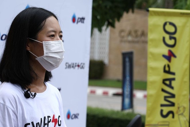 นางสาวอาวีมาศ สิริแสงทักษิณ กรรมการผู้จัดการ บริษัท สวอพ แอนด์ โก จำกัด (Swap & Go) กล่าวว่า เรามีการสำรวจพฤติกรรมของผู้ขับขี่ให้บริการ Delivery หรือ ไรเดอร์ พบว่า ต้องการใช้งานรถมอเตอร์ไซค์ไฟฟ้าที่สามารถรองรับการให้บริการลูกค้าได้อย่างต่อเนื่องเพื่อทำรายได้สูงสุด และปัญหาหลักที่ทำให้ยังไม่สามารถเปลี่ยนมาใช้มอเตอร์ไซค์ไฟฟ้าได้ คือแบตเตอรี่ที่ต้องใช้เวลานานในการรอชาร์จ ซึ่งไม่สอดคล้องกับการใช้งานจริง เราจึงเล็งเห็นว่ารูปแบบธุรกิจการให้บริการสลับแบตเตอรี่นี้ สามารถตอบโจทย์การใช้งานให้กับลูกค้าได้อย่างมีประสิทธิภาพ โดยมุ่งเน้นออกแบบกระบวนการใช้งานให้ง่าย สะดวก และทันสมัย ผู้ใช้งานสามารถดาวน์โหลดแอปพลิเคชัน Swap & Go เชื่อมต่อกับรถมอเตอร์ไซค์ไฟฟ้าที่รองรับการใช้งาน เพื่อตรวจสอบปริมาณแบตเตอรี่ ค้นหาตำแหน่งสถานีสลับแบตเตอรี่ จองแบตเตอรี่ใหม่ล่วงหน้า และมีระบบนำทางไปยังสถานี เมื่อไปถึงสถานีแล้ว สามารถสแกน QR code เพื่อสลับแบตเดิมที่หมดกับแบตใหม่ที่พร้อมใช้งานในตู้ชาร์จด้วยตัวเองได้อย่างสะดวกและรวดเร็ว